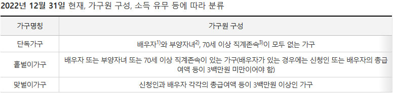 2022년 6월 1일 현재 가구원이 소유하고 있는 재산 합계액은 2.4억원 이하로 제한됩니다. 이 합계액은 주택, 토지, 건축물(시가표준액), 승용자동차(시가표준액, 영업용 제외), 전세금*, 금융자산, 유가증권, 회원권, 부동산 취득 권리 등의 합계입니다. 이때, 부채는 차감하지 않습니다. 이러한 규정은 조세특례제한법 시행령 제 100조의 4 3항에 따라 정해졌습니다.