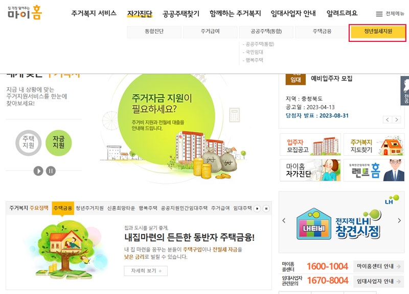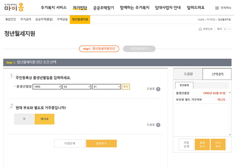 마이홈포털(www.myhome.go.kr) 또는 복지로 누리집 사이트(www.bokjiro.go.kr)에서 자가진단을 해보면 본인이 금번 청년월세 특별지원을 받을 수 있는지 미리 확인해 볼 수 있어 편리하다.
